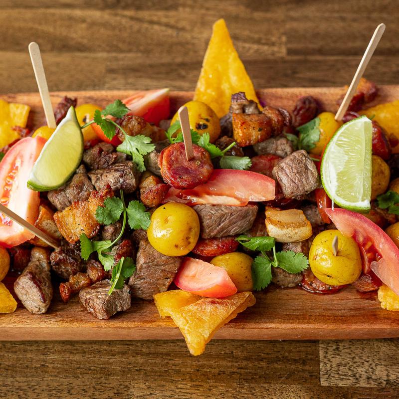Pork belly, sausage, steak, arepa chips, criolla potato.
