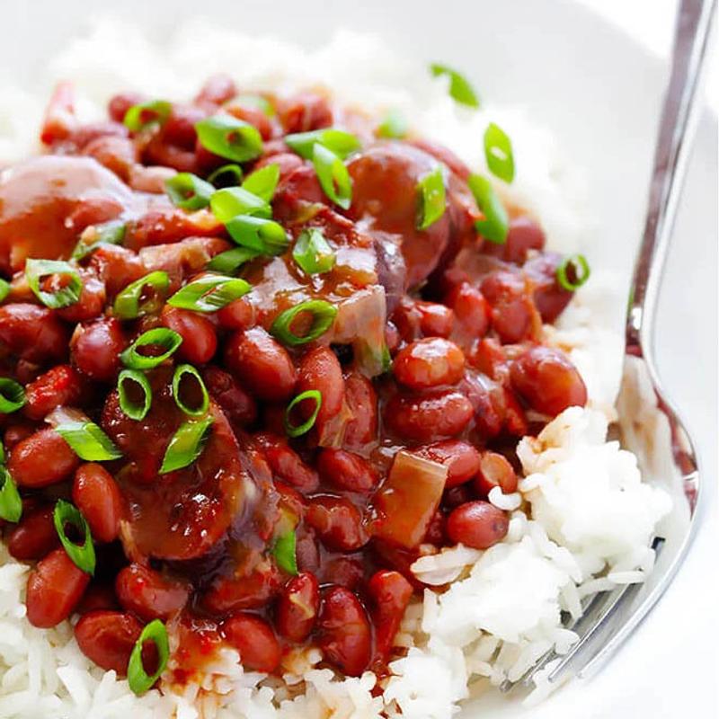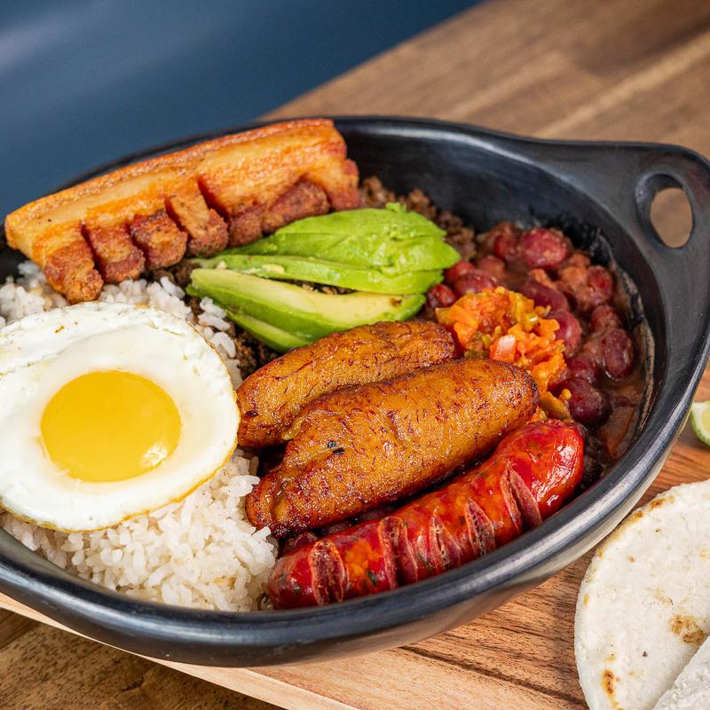 White rice, Colombian beans, Colombian sausage, Pork belly, fried egg, beef, avocado sweet plantain.
