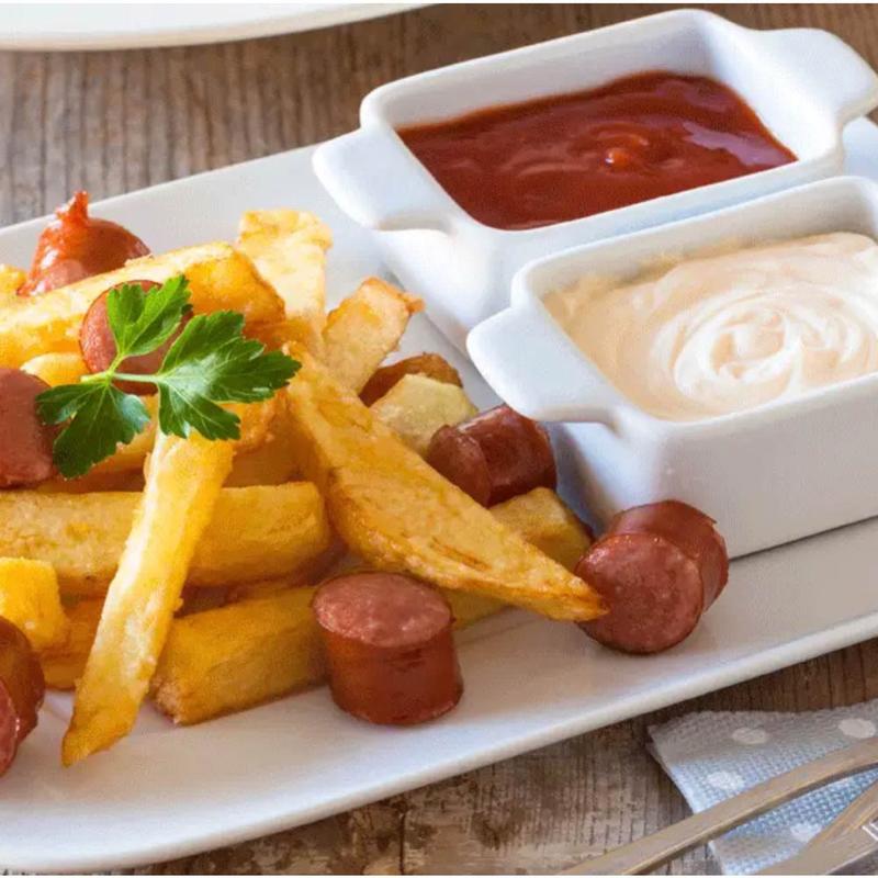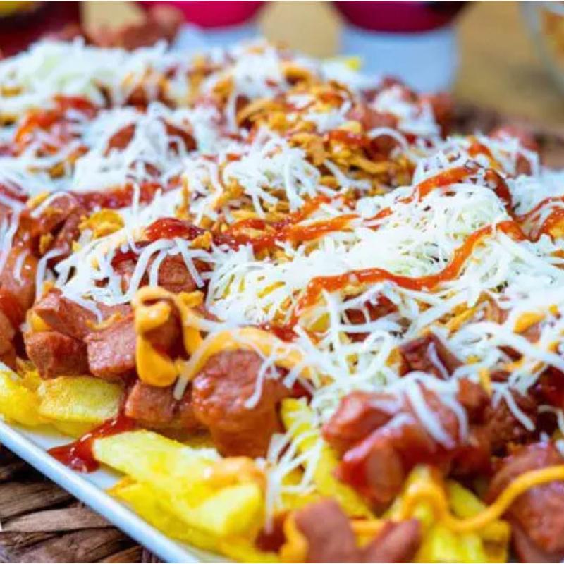 French fries, hotdog wiener, melted mozzarella cheese, quail eggs, house sauce.