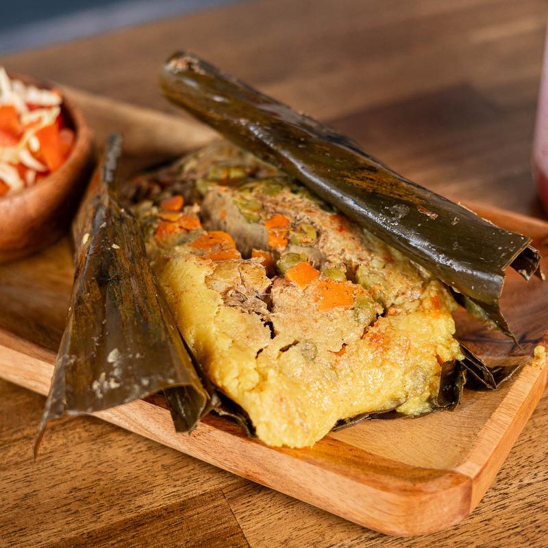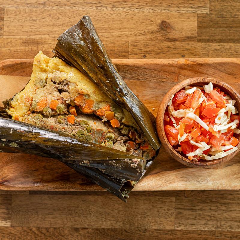 Corn dough with pork, potatoes, carrots, green peas, wrapped on a banana leaf.
